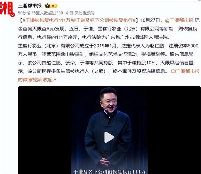 10 月 27 日,相声演员于谦,连同他持股的墨客行影业有限公司,被法院恢复执行111万余元。