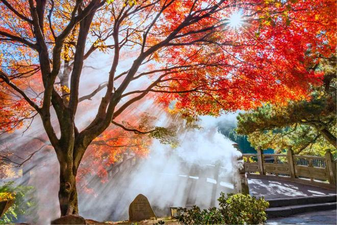 在花径红叶林人工燃放摄影烟饼,营造红叶树下“丁达尔光”拍摄氛围。并免费提供手举牌、古风油纸伞等道具,游客可拍摄创意照片。